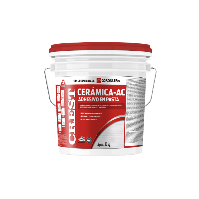 CREST CERÁMICA AC® es un adhesivo orgánico flexible en pasta, listo para su uso y de espesor de trabajo entre 2 mm y 6mm, formulado para una alta adherencia en base a látex acrílico, polímeros especializados y aditivos químicos para lograr una consistencia cremosa, que se extiende rápidamente, con un buen rendimiento y de fácil aplicación